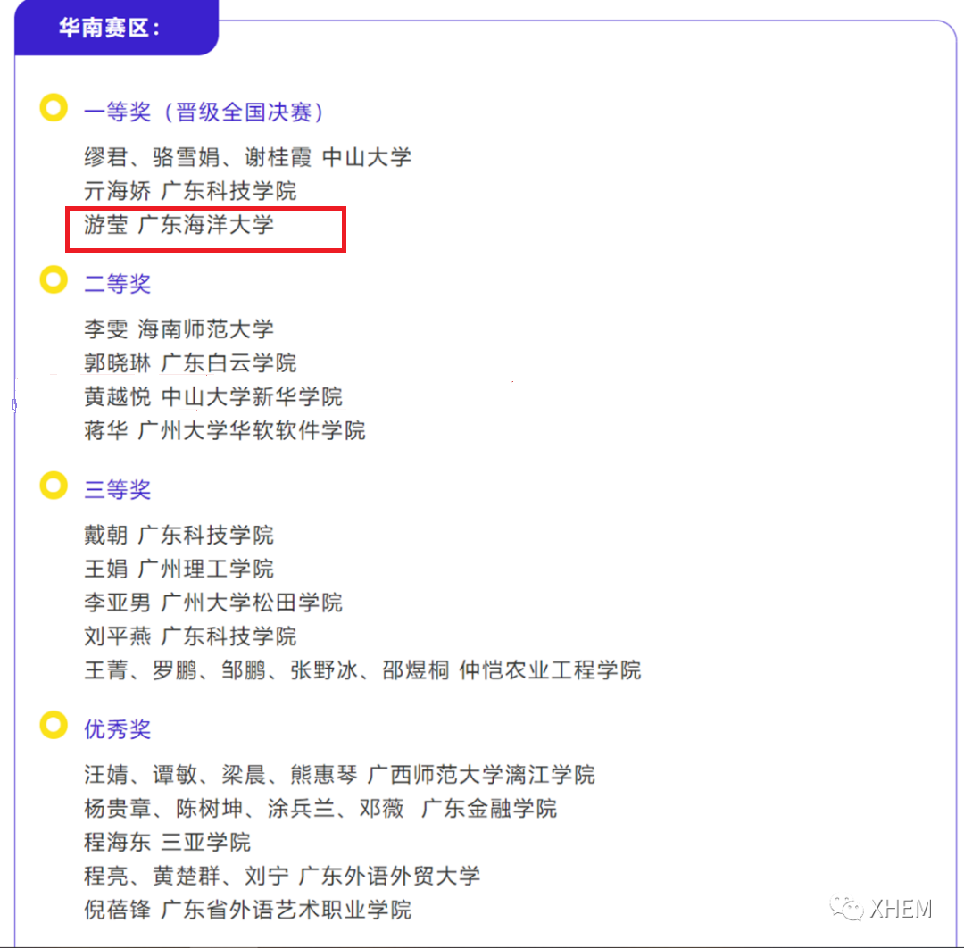 近日,在首届全国翻译技术教学大赛上,EMC易倍教师游莹荣获华南赛区一等奖。大赛在全国翻译专业学位研究生教育指导委员会、世界翻译教育联盟(WITTA)的指导下,由世界翻译教育联盟翻译技术教育研究会(WITTA TTES)与广东外语外贸大学高翻公司翻译技术教育与研究中心联合主办。此次大赛共分为七个赛区,每个赛区有3-5名业内专家组成评委组进行评审。评委名单提交大赛学术委员会审核同意后,分赛区评委组对各自赛区的作品全程进行匿名评审,最后取评委组的平均成绩进行组内排名,成绩提交全国组委会。全国组委会核对无误后,加入个人选手信息,按照大赛规定的奖项比例产生最终获奖名单。