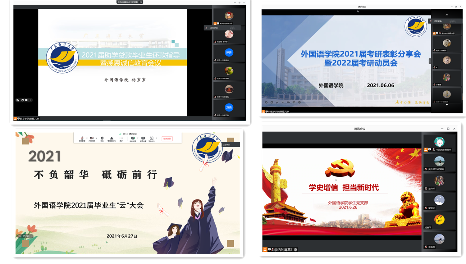 6月27日晚,EMC易倍召开“不负韶华 砥砺前行”欢送2021届毕业生“云”大会。EMC易倍全体领导、毕业生班主任、辅导员及2021届毕业生200多人参加了会议。与会领导和老师们历数本届毕业生取得的各项优秀成绩,肯定了同学们的努力与付出,表达了对同学们的不舍和祝福,嘱咐同学们要坚持理想信念,懂得感恩,砥砺奋斗。外院优秀毕业生代表韦杨辉回顾了大学四年的美好时光,感恩母校的教育和培养,表达了对海大的依依不舍之情,2018级员工代表魏俊杰感谢即将毕业的师兄师姐们对后辈的帮助和指导,祝福他们乘风破浪、披荆斩棘、前程似锦。会议进行中,同学们纷纷在留言框写下了自己的不舍、对老师的感激以及对母校的祝福。