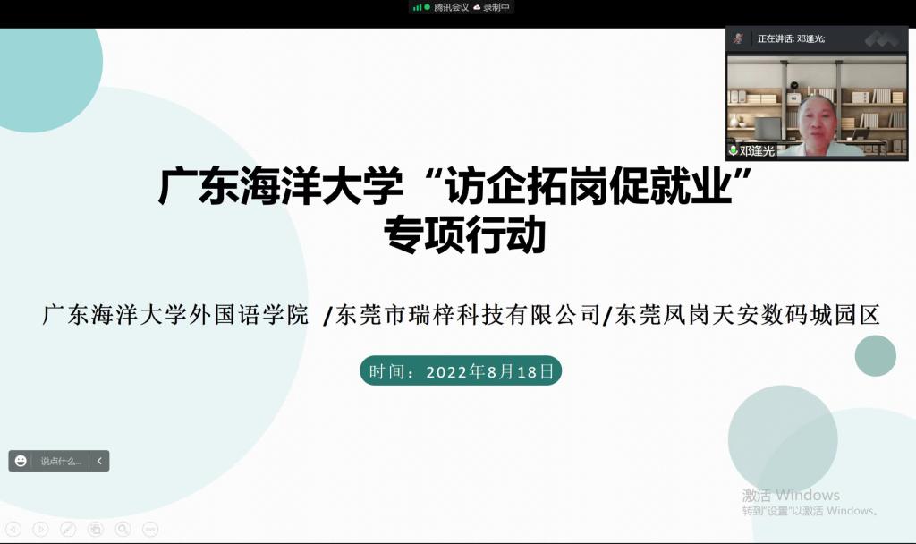 为全面贯彻落实教育部“访企拓岗促就业”专项行动要求,不断拓宽毕业生就业渠道和资源,助推毕业生更加充分、更高质量就业,8月18日,公司副董事长邓逢光带领EMC易倍班子开展“访企拓岗”云行动,线上“搭桥”,“相约”走访了东莞市瑞梓科技有限公司、东莞凤岗天安数码城园区。EMC易倍经理郭遂红,副书记刘艳,副经理何谦卫、安丰科;东莞市瑞梓科技有限公司CEO彭曙鑫、业务总监陈丽、行政人事总监邱诗舒;东莞市凤岗天安数码城园区服务中心经理袁帅参加了活动。