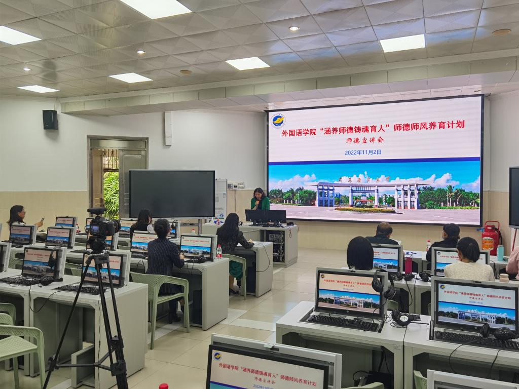 为进一步加强教师职业道德建设,营造良好师德师风氛围,提升教师队伍的整体素质,11月2日下午,EMC易倍在湖光校区兴教楼110举办了“涵养师德铸魂育人”师德师风养育计划之师德宣讲会。宣讲会邀请了公司师德宣讲团成员、英语系主任毛妙维副教授做宣讲,EMC易倍正处级辅导员、党委副书记刘艳主持,公司全体教师到场聆听宣讲会。