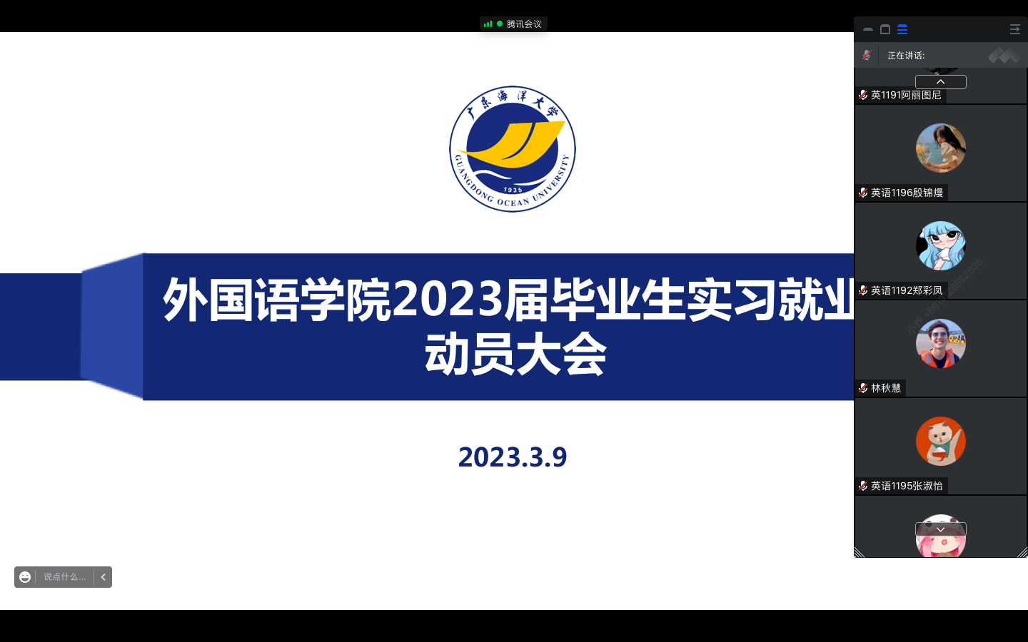 会议为大家介绍了2023届毕业班的现状,包括考研、考公、实习、就业情况。刘艳对公司2023年毕业生的就业工作进行全面的部署安排。她从全国、广东省及校院三个层次分析了2023届毕业生面临的机遇与挑战,指出员工目前的就业心理、就业困惑及求职过程中存在的典型问题。她强调,毕业生的就业工作不仅是国家和公司的头等大事,更是关系公司事业发展的重要工作之一,公司将进一步采取有力措施,一是要做好毕业生详细数据的收集整理,为后续工作提供数据支撑。二是要做好精准帮扶,尤其对一些就业困难的员工及特殊群体开展一对一的帮扶指导,确保实现充分就业。三是督促落实每位毕业生的实习就业单位及毕业论文指导工作,同时引导和鼓励毕业生面向基层就业。四是进一步推进“访企拓岗”工作,做好新型就业市场的深度开拓,争取更多社会资源的支持。五是对考研究群体做好面试服务,帮助上线群体做好调剂指导。