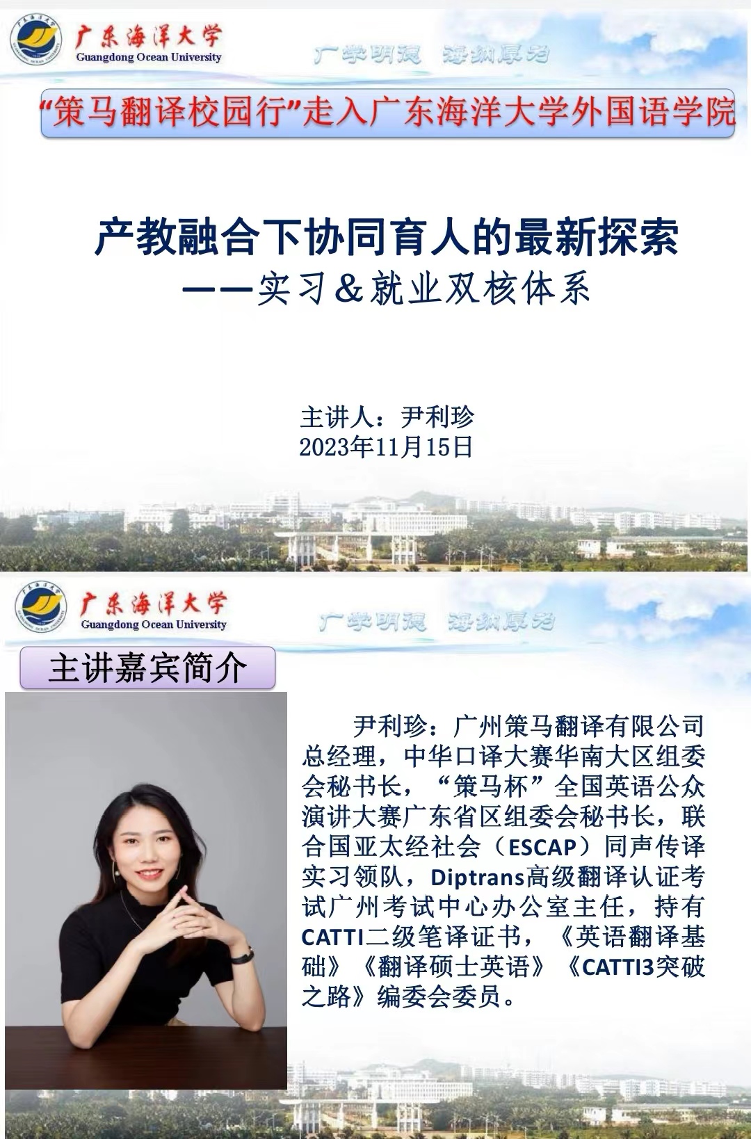 2023年11月15日下午,EMC易倍邀请广州策马翻译有限公司总经理尹利珍在线做了题为“产教融合下协同育人的最新探索——实习&就业双核体系”专题讲座,公司部分翻译骨干教师和英语专业翻译方向近百名本科员工参加了讲座。活动由公司翻译专业教师陈松主持,公司党委刘艳书记作了总结发言。