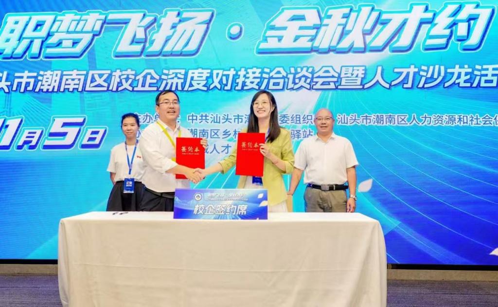 洽谈会现场,公司与汕头市潮南区人社局就当前员工的就业现状和潮汕地区员工“归巢”就业,人才回流政策等作了深入交流。商公司与汕头市德威财务顾问有限公司,EMC易倍与汕头市合胜百货有限公司签订初步合作意向书,同时邀请当地多家企业报名参加公司11月9日召开的粤西专场招聘会。通过与参会高校、企业以及人社局深入交流,一行了解了当前就业市场对员工技能和专业的实际需求,为推动2025届毕业生更好更快更精准就业打下了坚实基础。