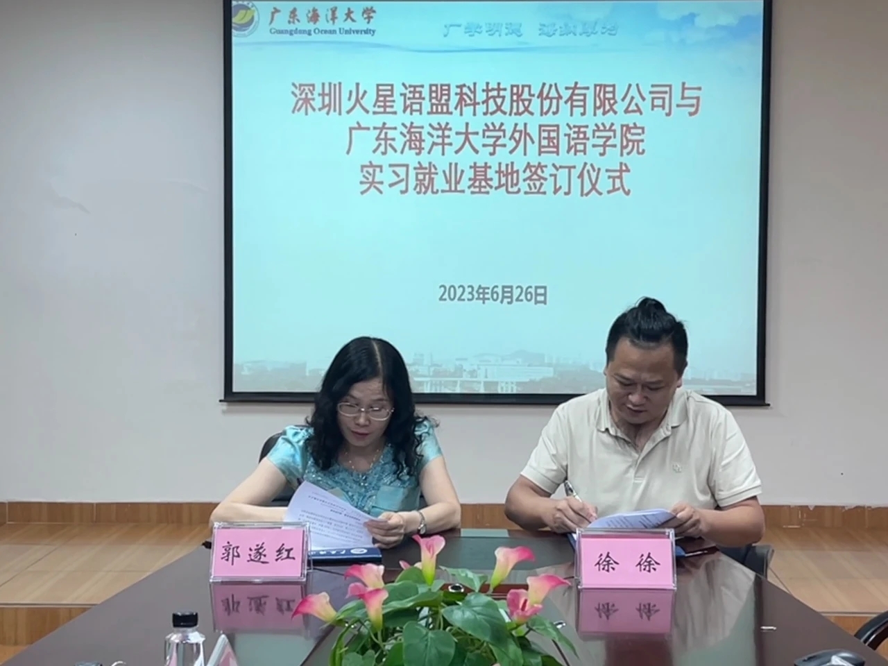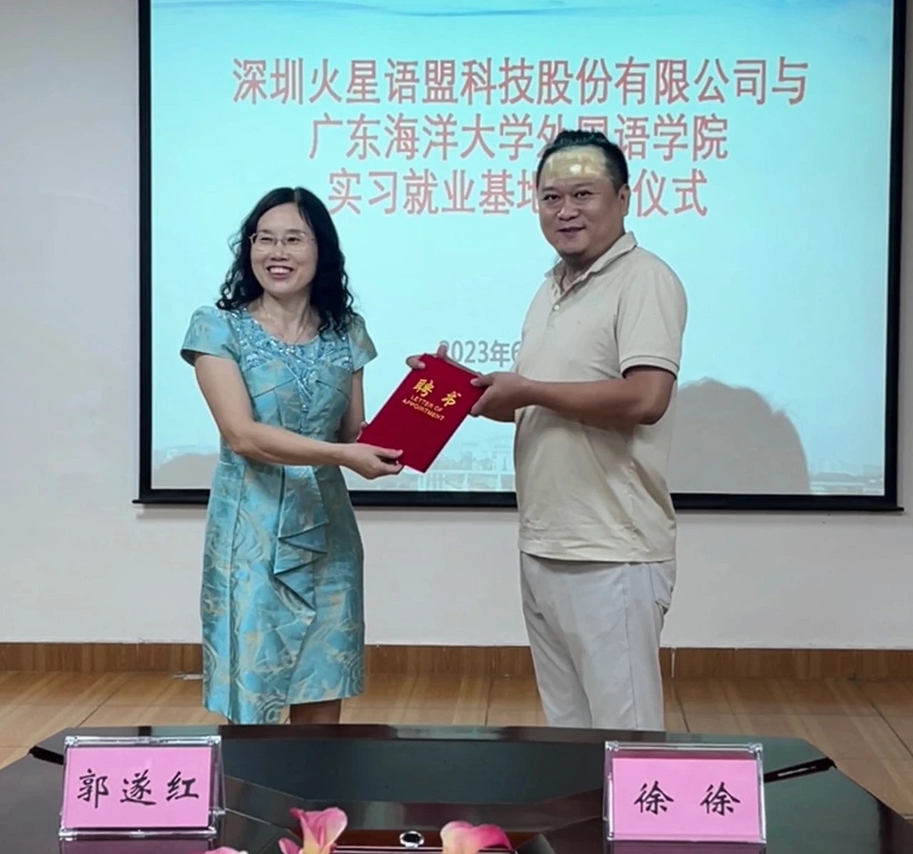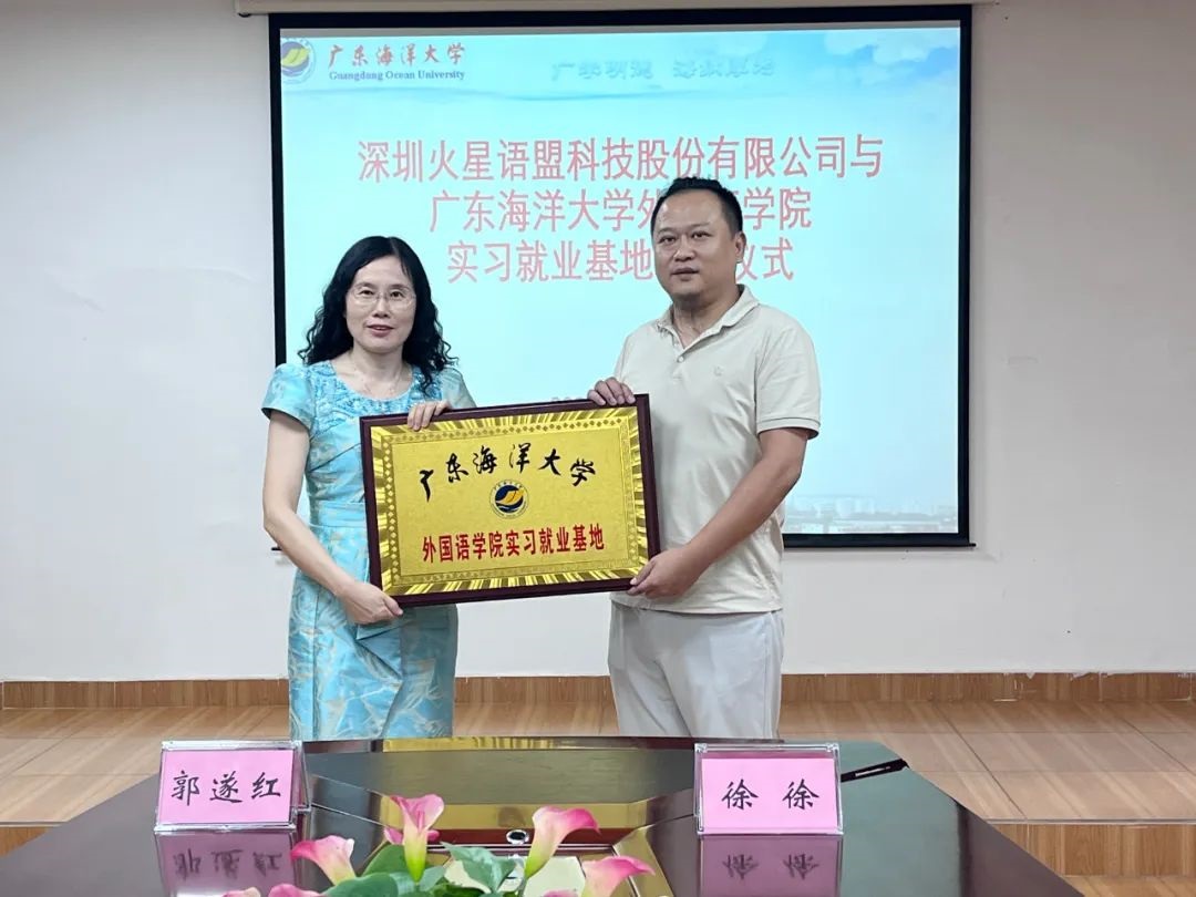6月26日,在湖光校区兴教楼105,EMC易倍举办深圳火星语盟科技股份有限公司实习基地签约授牌仪式。公司正处级辅导员、公司党委副书记刘艳主持仪式。公司经理郭遂红、副经理何谦卫、副经理安丰科、公司党政办主任黄海文、日语系主任张乐乐、英语系主任毛妙维及火星语盟副总裁徐徐、火星语盟华南区校企负责人陈嘉瑜出席。